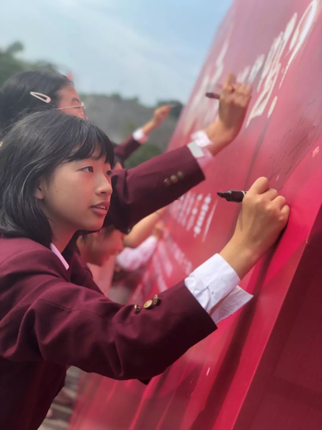 師生與家長共同來到孔子廣場,裝扮心意樹,并簽名留影。他們把誓言簽在誓師墻上,把心愿寫在福袋里,把愿望掛在心意樹上,把笑容留在合影里,他們用這樣獨特的方式宣示青春、宣示夢想,宣示著他們決勝中考的決心!