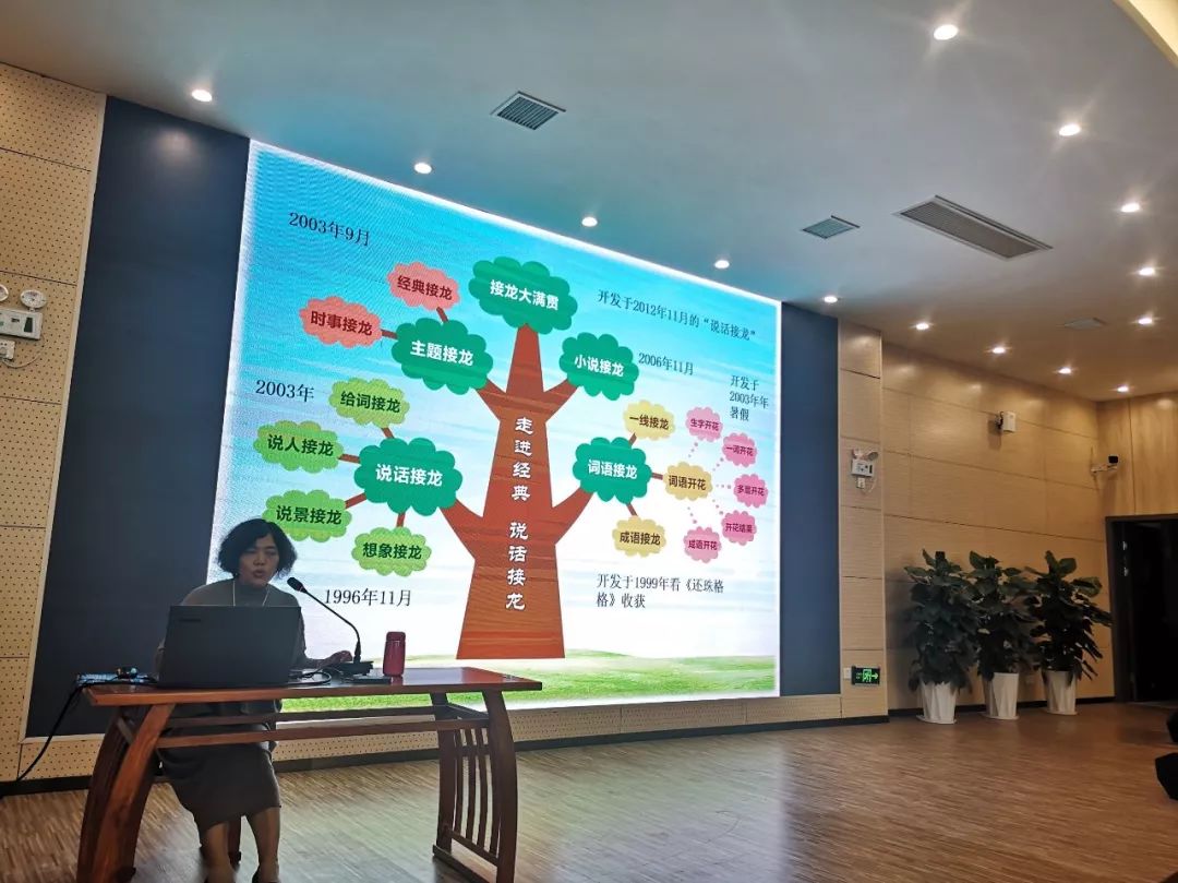 課堂結束后,丁老師又在階梯教室進行了《說話接龍之積累、激活、應用》的講座,和老師們分享了“生字開花 ”“說話接龍”教學的意義和具體實施方法。