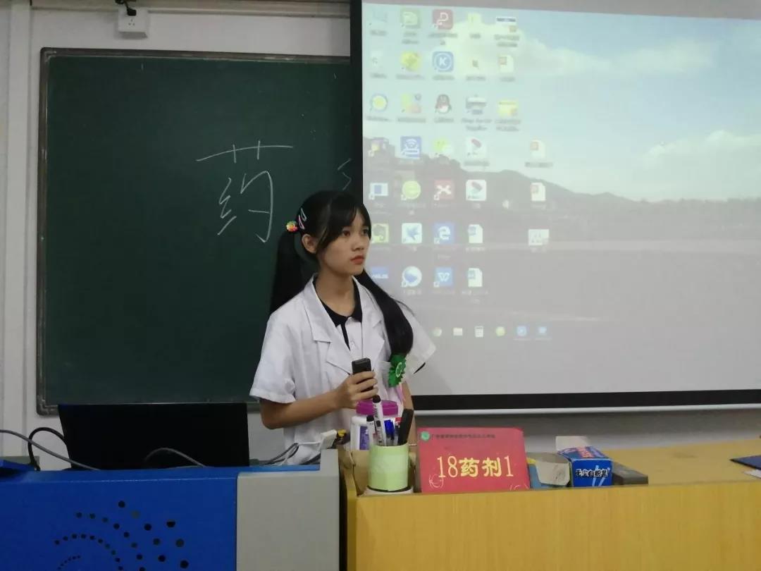 來自藥劑專業,各個班級的參賽小隊展示屬于他們的團隊風采!向評委老師介紹這個團隊的名字,為什么取這個名字,他們的團隊精神,怎么去經營這個藥店,哪位是他們店內的執業藥師、營業員、收銀員等,還有運用銷售技巧銷售藥品。