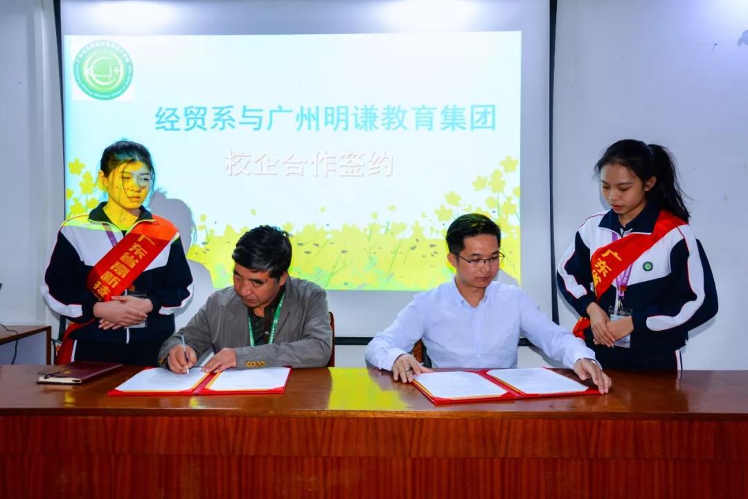 廣州明謙教育集團龍煥輝總經理,幼兒園園監陳楚越園長、陽光幼兒園陳海燕園長,教務處田春元處長、經貿系向莎莎主任、經貿系幼兒教育組林紅霞老師、經貿系幼兒教育專業林佳峰老師、17幼師(五年制)班班主任孫啟磊老師、經貿系邢夏盈老師出席了簽約儀式。