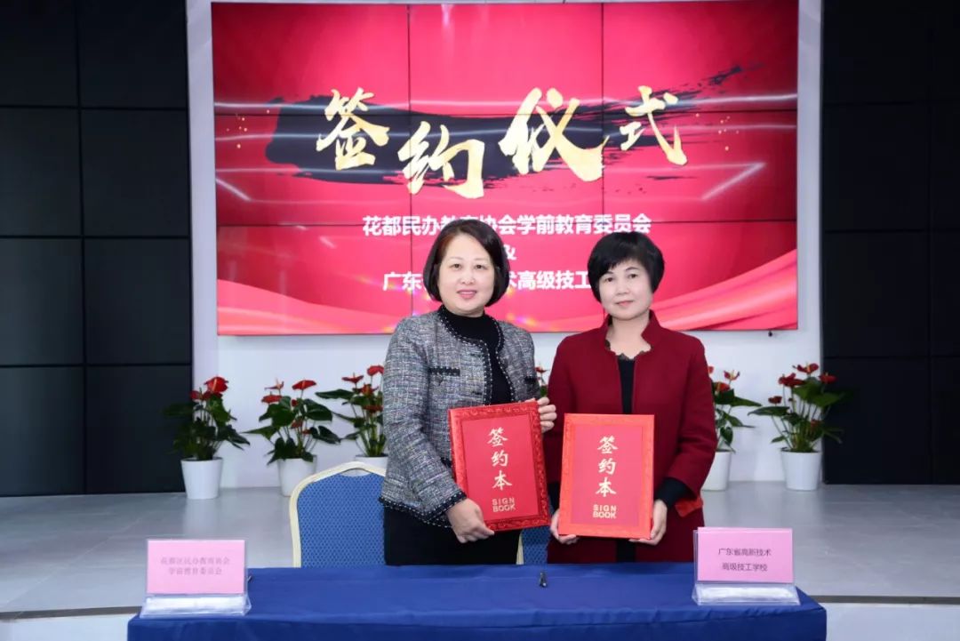 花都區民辦教育協會學前教育委員會會長畢飛與廣東省高新技術高級技工學校執行校長肖中圓簽定戰略合作協議。