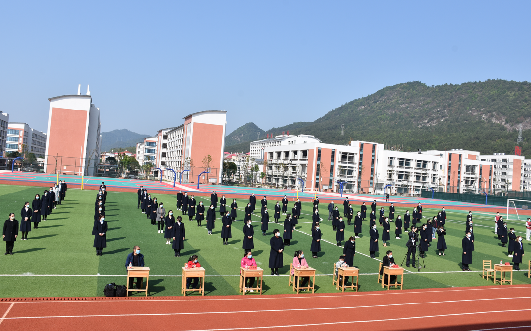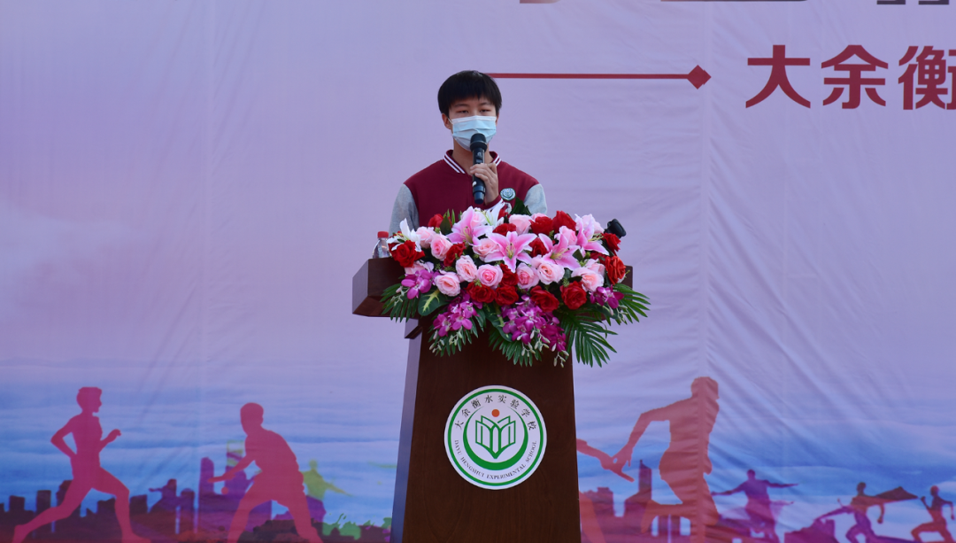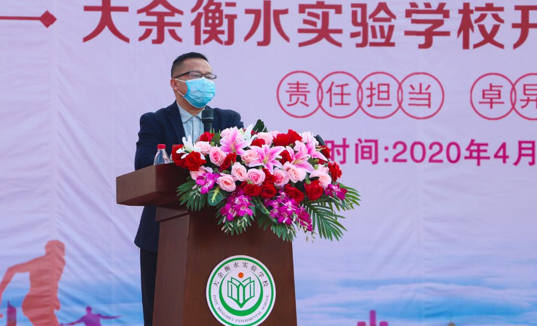 2020年4月9日,大余衡水實驗學校舉行了復學的第一次升旗儀式,全體教職員工相聚學校田徑場,1600余名學生在線同步觀看直播,以隔空參與的形式共同見證了這充滿紀念意義的升旗儀式。現場邀請了大余縣衛健委謝芳華副主任以及大余縣人民醫院腫瘤科王啟平主治醫師、內三科彭聯平主治醫師、中醫院王穎娟護士三位抗疫英雄代表參加此次儀式。