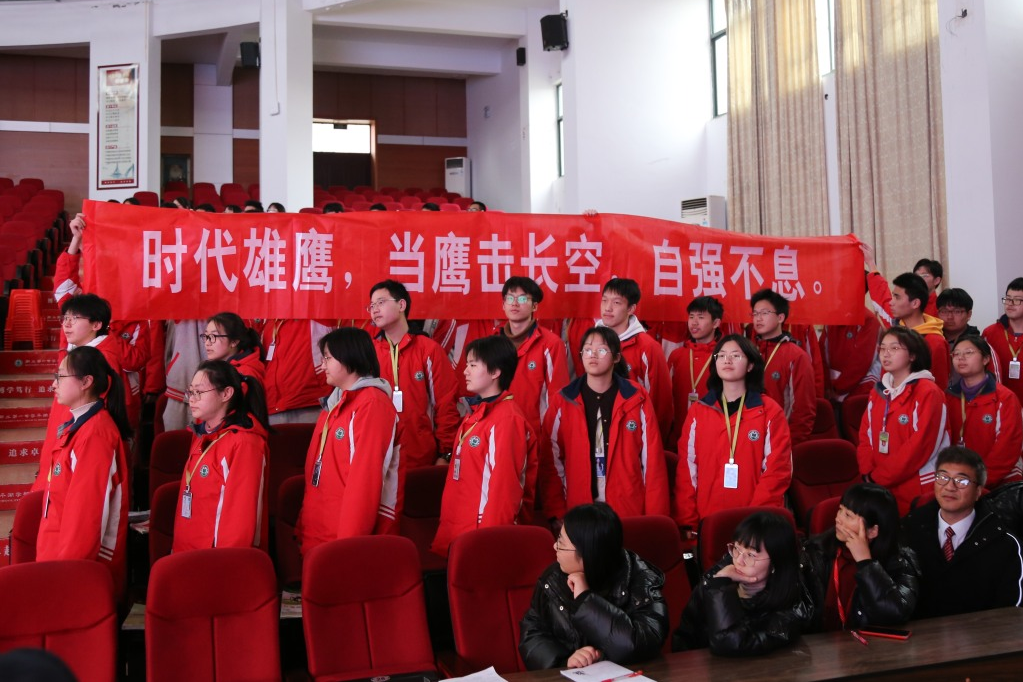大會第四項,高三1班蔡澄寬同學代表高三全體同學發(fā)言,他向所有正值青春年華的高三學子發(fā)起號召:自信拼搏,不退縮,不彷徨,努力搏長空,舉目望蒼穹,圓夢火紅六月。